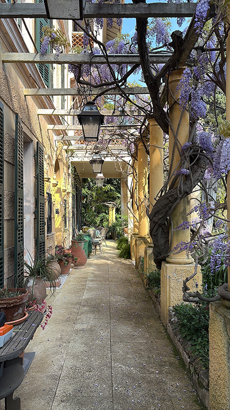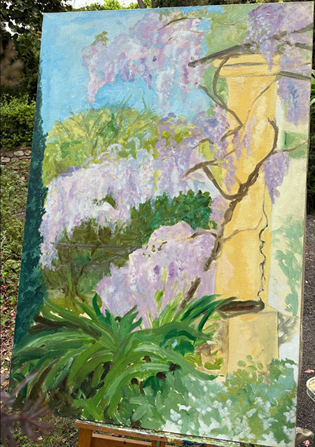 Immediately following my residency in Eze in March, the subject of the previous Monthly News, I painted in a famous garden in Menton, Le Clos Peyronnet. I had only a few days before packing up for an epic trip to Inner Mongolia and Tibet, so I set up on the front lawn of the villa and painted the peristyle covered in purple wisteria from two different views, adding some architectural features, somewhat rare in my work. Capturing that spring light was a sublime experience.